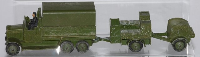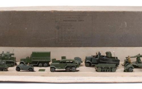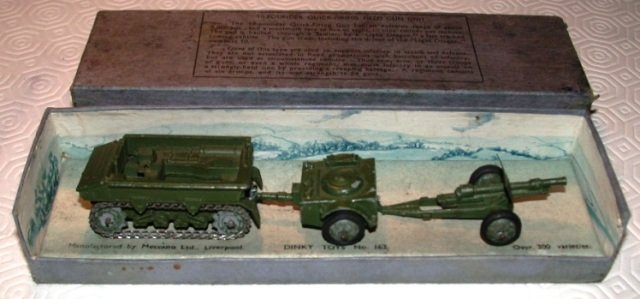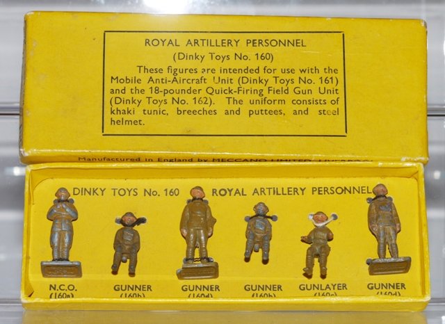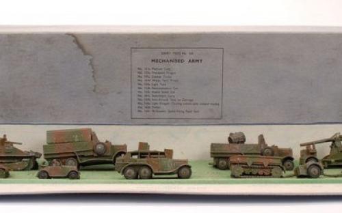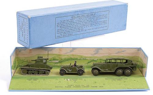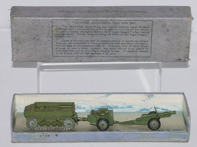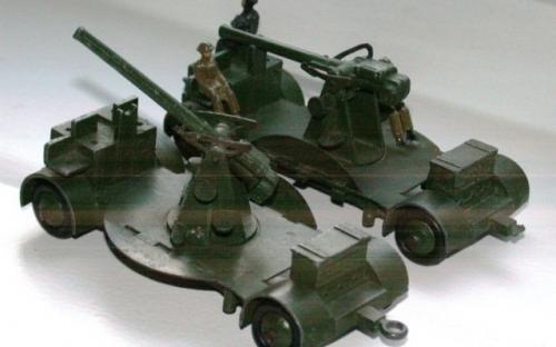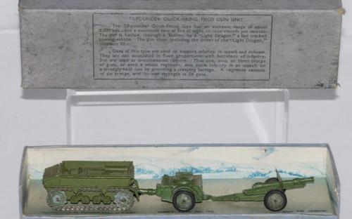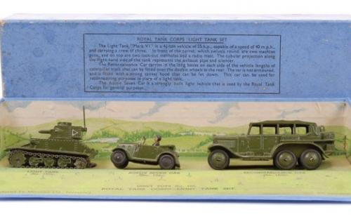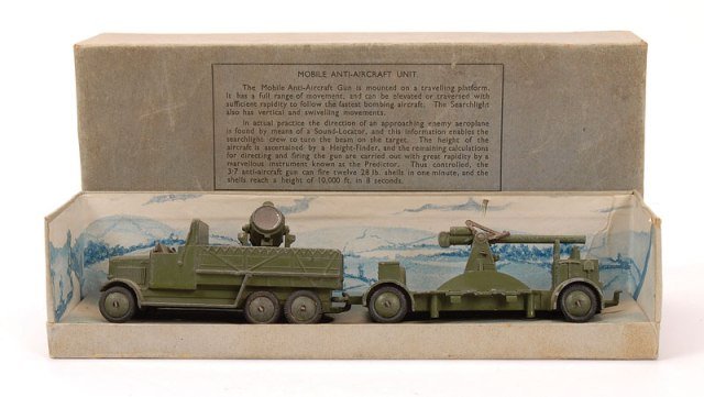 The items in this gallery include all the sets and individual military items produced pre-war with the exception of the 22f army tank. There are examples of the sets as well as the individual items. Many of these items were also produced after the war until newer designs were produced during the early 1950s. However, most of the early post war military items were only available for export, especially to the US market. Some of these pre-war designed miltary items, which were based on designs thatbwere obsolete even at the outbreak of the War, survived the renumbering in 1954 and were still listed in the 1954/5 USA Catalogue a scan of which is contained in the Dinky documents archive in the members' section of the website.