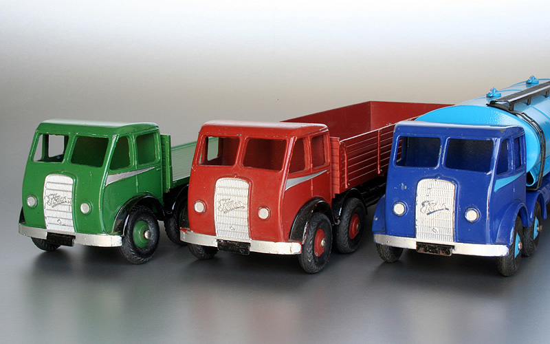 When I made some piotures today, I had to include one rare Foden. It is a 501 first type wagon in red with a pale grey body. A more common red wagon with a fawn body and a grey wagon with a black chassis are pictured alongside for comparison. I hope it is visible on the picture that the pale grey body is much lighter than the other two bodies. I bought the red/pale grey Foden direct from the first owner in his carpenter workshop many years ago. He thought he got it as a Christmas gift in 1948 or 1949. At the time when I bought it, I think it was my eight Foden and I realised its rarity much, much later. I have seen only one more red/pale grey wagon at the Sandown toy fair some years ago.