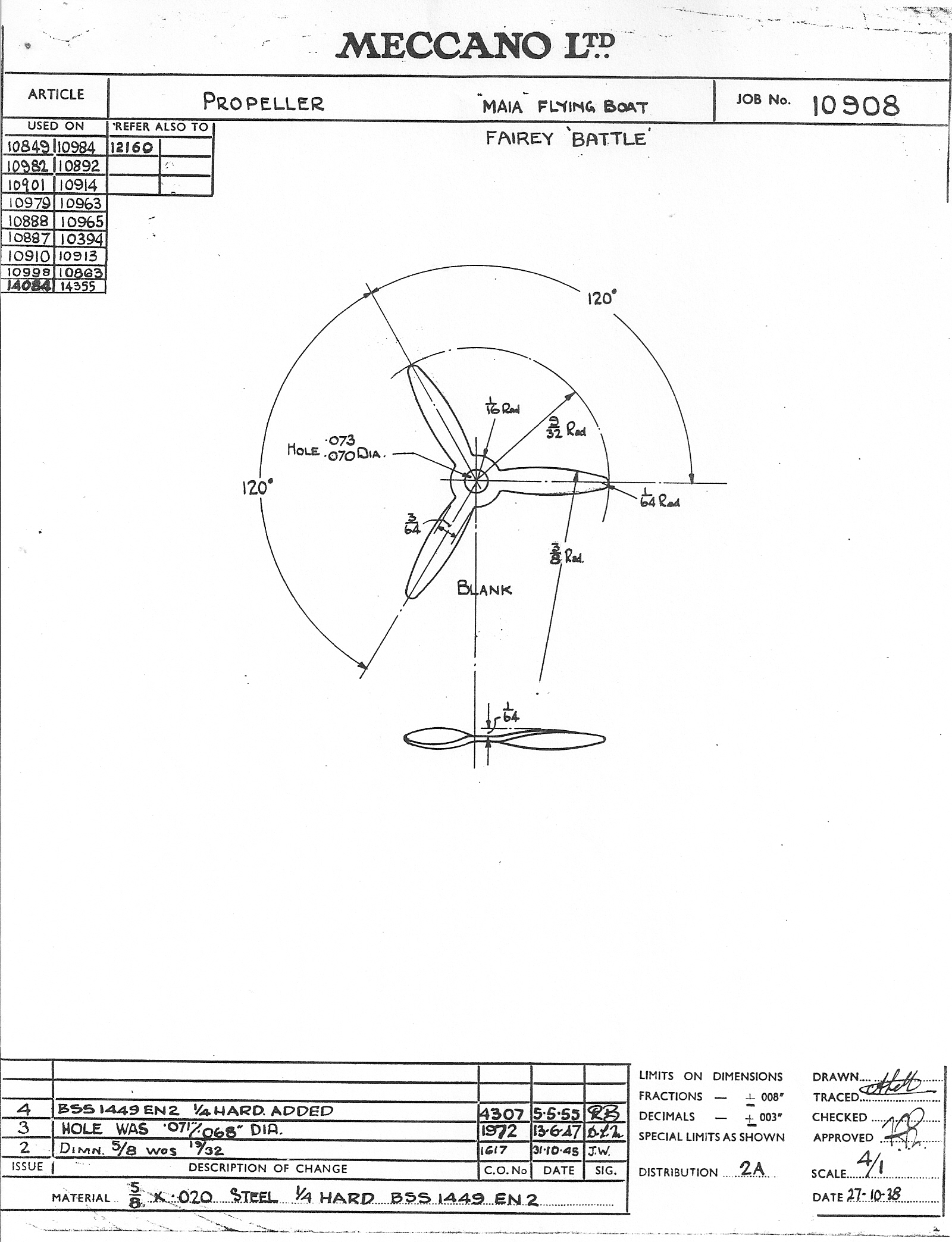 Publication Year: 1939Publication Type: Factory DrawingsCountry: EnglandThis is the factory drawing for the Propellor for Maia Flying Boat and Fairey Battle as well as various other pre-war and post war aircraft. This image has been donated to the DTCA by Mike Richardson.