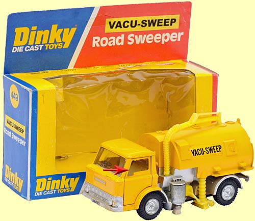 There is an other promotionnal for made for "VACU-SWEEP" which is also all yellow. Although there is no evidence, this is probably also a code 2 model with stickers applied by who ever Vacu Sweep is or was. Although this model has opening cab doors and is a # 451, it has been packed in a # 449 hanging type box and yellow stickers have been applied probably by Vacu-Sweep to hide the name Johnston on the box front ends.
