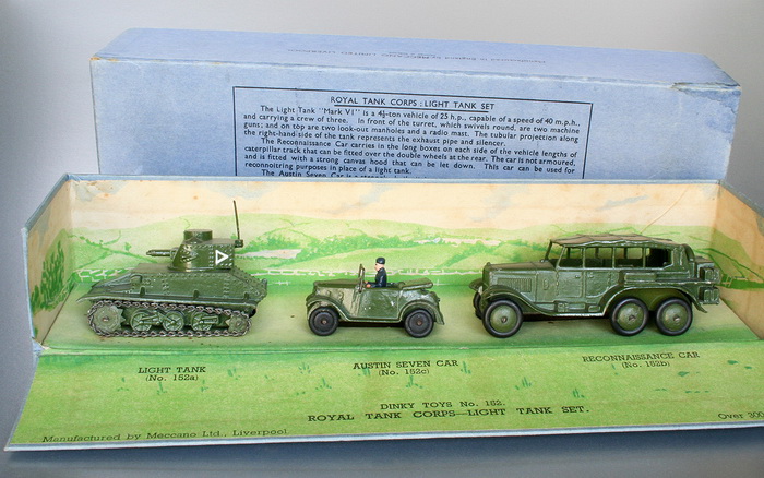 Pre-war Dinky Toys 152c Austin Seven Car in military version with driver in 152 Royal Tank Corps - Light Tank Set – casting same as 35d. Photo Jan Werner DTCA.
