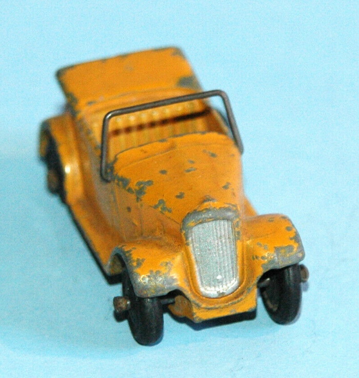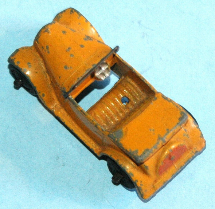 Pre-war Dinky Toys 35d Austin Seven Car 1938-1948. It had a solid closed silver coloured steering wheel and a hole in the chassis for a driver of the military version.