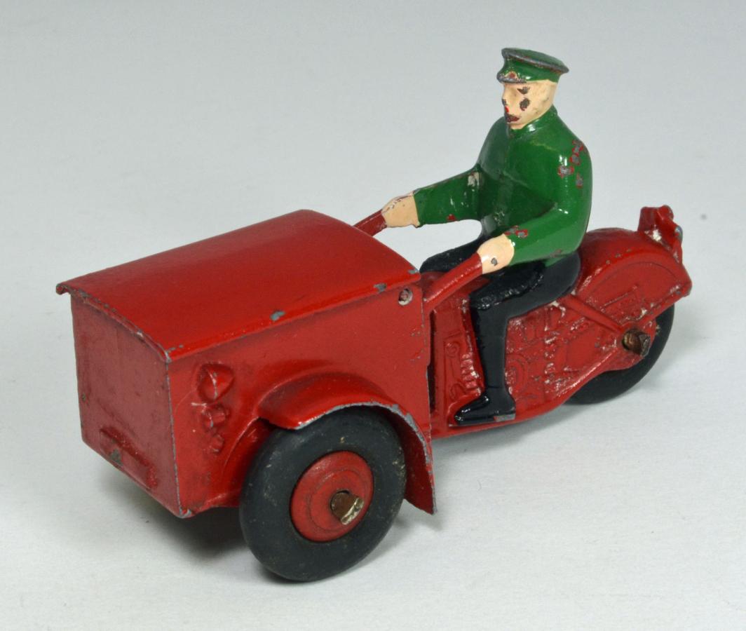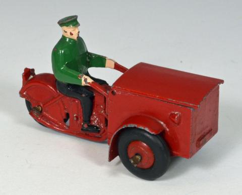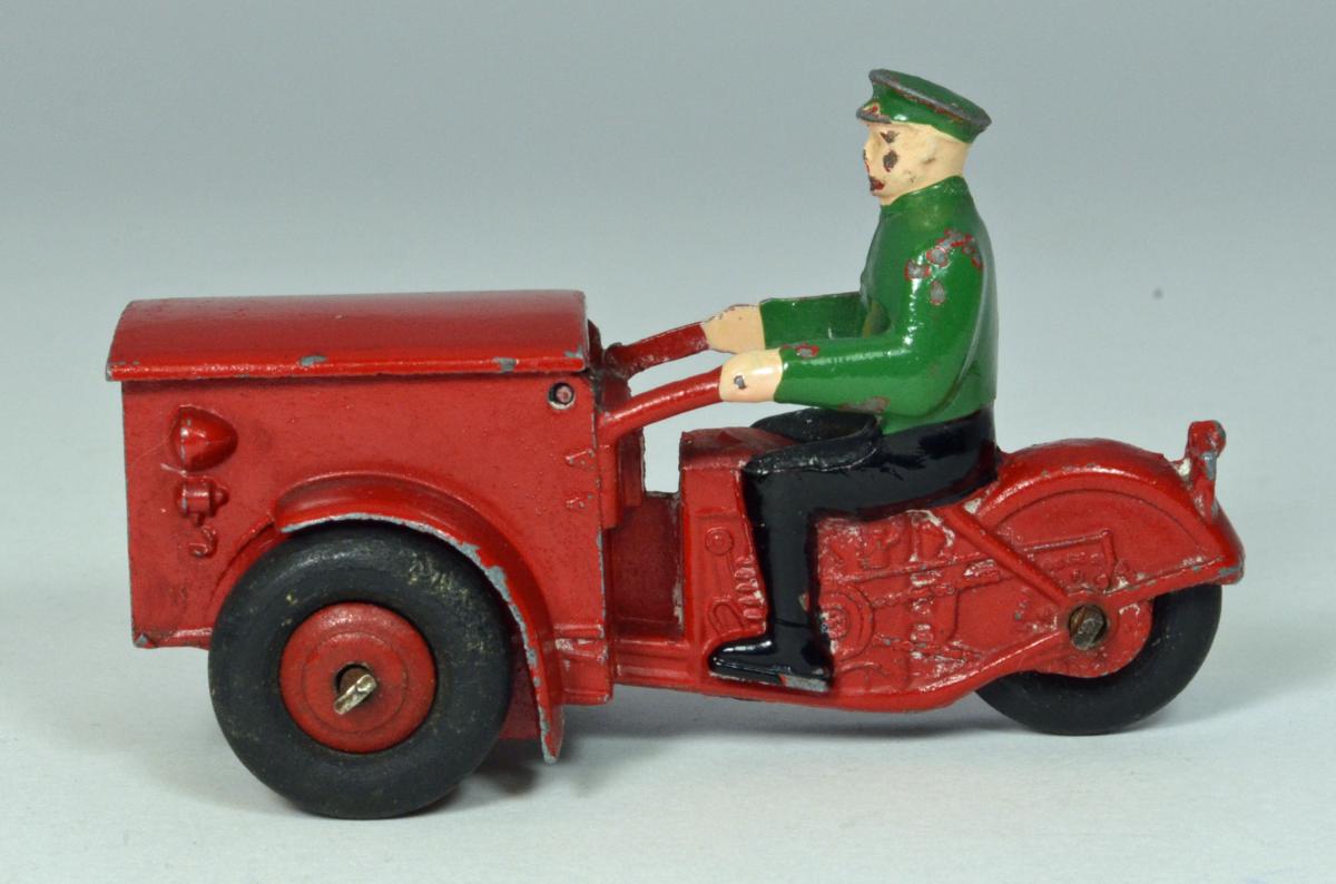 Just arrived today....a new model, and one I have been wanting for some time, the Tri-Porteur, #14. Some quick checking showed that this was introduced in 1935, discontinued during the war, then re-introduced right after the war, and made through 1952 before being discontinued. It was made in a variety of colores, both pre and post war. Earlier models has white Dunlop tires, and starting around 1950 they came with the familiar black "m" tires, which mine has. The Dinky Toys Encyclopedia says the scale is 1:40, meaning this is quite a bit larger than the automobiles produced at the same time. A common problem with this model is the hinged lid coming detached from the box beneath it. It is held in place by only two, tiny pins, each protruding into the side of the box. The pins appear to be no more than about 1/3 the diameter of an axle, so they can break or dislodge very easily. I can imagine only light playing with this model would result in the lid disappearing! The French factory did a nice job in painting this, as the drivers pants and shoes are painted a contrasting color to his blouse or shirt. Hands and face are flesh painted, with some rudimentary effort made to highlight cheeks and lips on the driver. All in all, a delightful little model, from a bygone era, but so typical of Dinky to make a model of it.