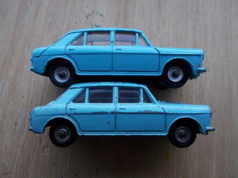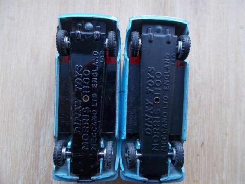 I have just acquired a second example of 140 Morris 1100, and noticed three slight differences between them The first and most obvious is that one has a glossy black baseplate, the other matt. The one with the matt base is a slightly deeper shade of blue, not readily apparent in the photograph, but consistent underneath the car as well, so not due to fading. This one also has pronounced casting lines on front and rear wings, indicating die wear and therefore that this is a later model than the gloss base version.