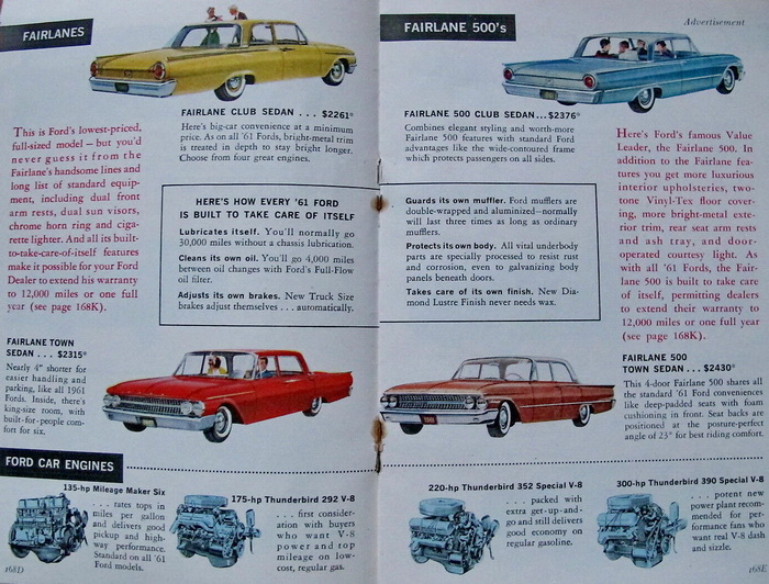 1961 Ford Fairlane 500 club sedan brochure: 2 doors and low line mouldings