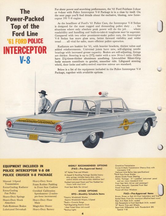 1961 Ford Fairlane Highway Patrol brochure with the new Police Interceptor 390 V-8 engine … designed for the most rugged and demanding police duty… for situations where only absolute peak power will do the job …