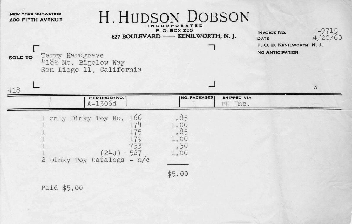 Also attached is the original invoice I received from H. Hudson Dobson, showing their date of April 20, 1960. This invoice shows the 174 Hudson Hornet, along with several other purchases....all for the princely sum of $5.00.....oh, those were the days! I was only 15 then, and near the end of the first phase of collecting Dinky's. I did not like the new models, with windows, shiny base plates, heavily treaded tires, and new colors....I was already "old school" by then, and actually have much the same feelings 58 years later. I am very glad that I had the foresight to save my HHD correspondance!