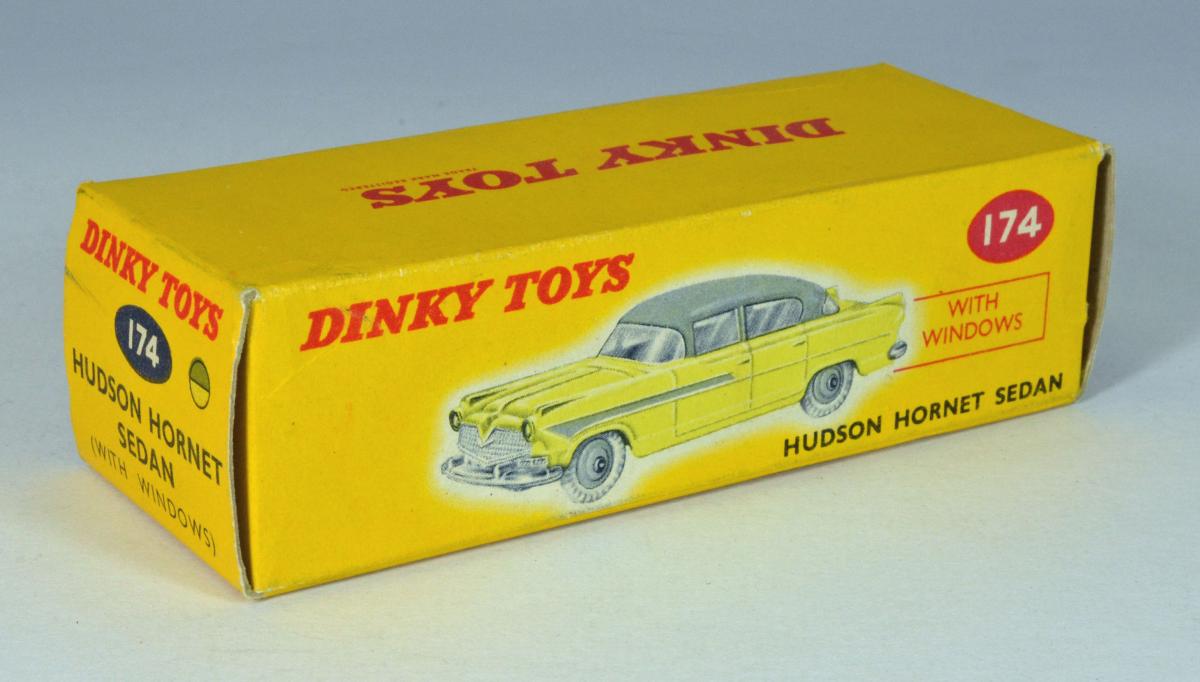 The Hudson Hornet was deleted from the Meccano inventory some time during the latter half of 1963. The Meccano Toys of Quality price list dated May 1963 includes the 174 Hudson Hornet. So too the UK 1963 Dinky Toys catalogue that was printed in July 1963 lists the Hornet as still being available. The catalogue issued specifically for the United States market, printed in May 1963, does not contain the 174 Hudson Hornet, as does a similar catalogue for the Canadian market printed much later in October 1963.