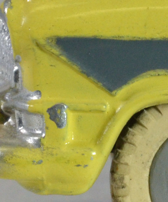 Turning our attention to that area of the front near-side mudguard, and it seems as if later issues, those with spun hubs, do not suffer from the excessive metal spill as was the case with my earlier with grey ridged hubs, and the other similar yellow model. Please excuse the quality of the models in one case and image in both instances.