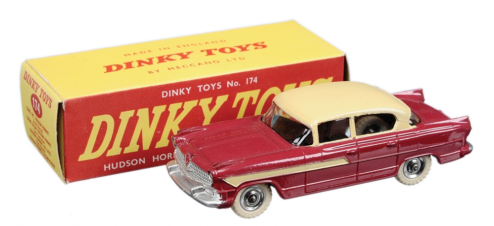 The model made its debut with the announcement on the back cover of the August 1958 “Meccano Magazine”, together with a fellow new arrival, the Dinky Toys 175 Hillman Minx, although the dealers in the United Kingdom were informed of these new releases when their standing order Invoice and initial trade pack of models arrived in July. The Meccano Toys of Quality price list printed in July 1958 also included the Hudson and Hillman.