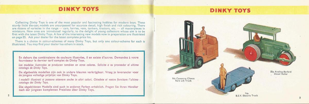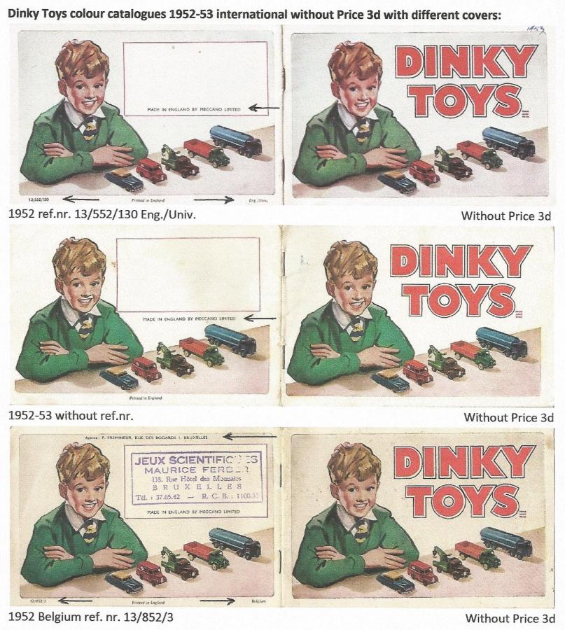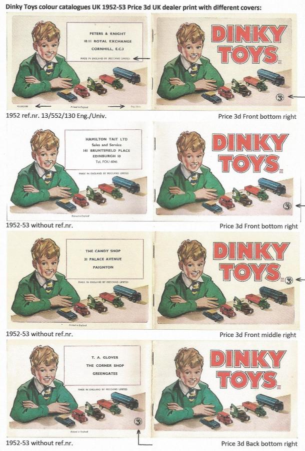 I have also an UK 1952 international colour catalogue Price 3d without ref.no, with an UK dealer print. There are differences in "The new models in preparation" on page 23 of both catalogues. According to the Dinky Toy compendium of Patrick Trench in volume 4 of the Hornby Companion Series are The new models in preparation of those with ref.no. 13/552/130 issued in 1952 (so it is a 1952 catalogue), while those without ref.no. were issued in 1953, so the last catalogue perhaps may be published after the Sept 1952 catalogue and may be just dated 1953? That's the question and the problem of no print code. All catalogues have a print code but just this one has not. Maybe that's why a question mark is behind the 1953 no ref. catalogue in the Ramsay. Remarkable in this case is that from the international catalogue without ref.nr. only model 23f, 25y and 29h of the "recent additions to the range of Dinky Toys" on page 22 are found in the UK Sept. 1952 catalogue and of all the "new models in preparation" on page 23 of the same catalogue even none model. This indicates that this catalogue must have been published after the Sept 1952 catalogue and in line of the reply of Bruce, perhaps 1252 or even 153. Production of "new models" went obvious not so fast before publishing new models in the Sept. 1952 catalogue. In the meantime of construction of the website I discovered a mistake in the list of UK catalogues in the Ramsay that solves my question in the begining. The first two 1952 UK DT catalogues in the Ramsay, mentioned in the beginning of this topic, were placed in the wrong list. These are general Meccano products catalogues and belongs in the list of Meccano catalogues of the Ramsay. I discovered the error because, besides the DT catalogues, I have almost all general UK Meccano catalogues and went to compare the DT list of Ramsay with the Meccano list of Ramsay. Remarkable is that also the colour catalogue 1952 Price 3d ref. 13/552/130 is not mentioned in the Ramsay. It was the first colour catalogue after the war and international in total 6 languages with no prices and the note: "Ask your dealer for the latest complete price list", so it is a very special catalogue for much countries. I possess one international catalogue for the Belgium market with the print code 13/852/3 (only 3000 copies!!) with exactly the same content as the UK catalogue with ref.nr. 13/552/130 Price 3d. Perhaps there are more country specific copies of these 1952 international colour catalogue? I possess 7 international colour catalogues 1952 with different covers, 4 UK 1952 Price 3d with UK dealer print and 3 international 1952 without Price 3d, all with identical content. I'll send a message about all this to the editor of the Ramsay. I am a contact person for the Ramsay catalogue before additions of the Dutch DT section, but send also additions/informations about UK, USA and French DT catalogues.