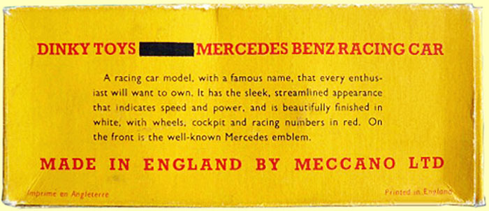 Jacques— Both the 238 D-Type Jaguar and the 239 Connaught Racing Car, have their model number in exactly that same position, with similar descriptive wording for the car’s accomplishments.  I am guessing that possibly Meccano (or the vendor who made the boxes) made a mistake on the model number for the Mercedes, in that area, and did not discover it until many, many boxes were already made.  They then had no choice but to black it out.  The size of the blacked out area looks to be just right for “No. 237”.    Just my guess....perhaps others have a better one?