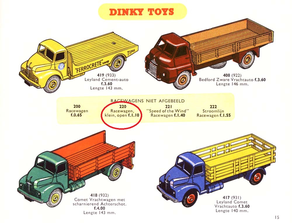 In the June 1952 MM issue the re-introduction of some outdated, previously discontinued models was announced, among them the 22a Small Racing Car. A page of the (NL) 1955 catalogue shows the last mentioning (no picture) in a Dinky catalogue. Kind regards, Jan