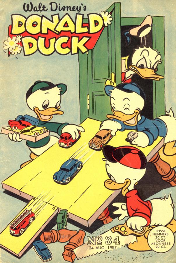 It is the 24 August 1957 issue cover of the Donald Duck, the Dutch Walt Disney strip weekly. The artist was apparently inspired by the Dinky Toys of his children, using some of them as examples. Easy to identify are the Bedford Van, Volkswagen and 555 Fire Engine on the slope, the Austin Somerset and Ford Fordor(?) down below, and the Oxo Van on the tray. Kind regards, Jan