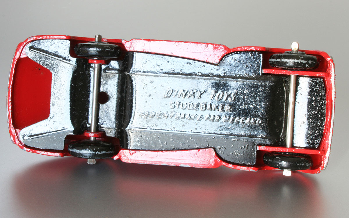One of the scarcer post-war French Dinky Toys issues, this Studebaker State Commander, or, as known in the French catalogue: Coupé Studebaker. The model, French no. 24O, was available in the tight period 1949-1951 only, and even shorter, in 1949 only with the all zamak wheels (tyres included). Like the British no. 39a Packard Super 8 Tourer, the die for the no. 39f  Studebaker State Commander was used in Paris for the production of French re-issues, after the discontinuation of the production of these models in the Liverpool factory.