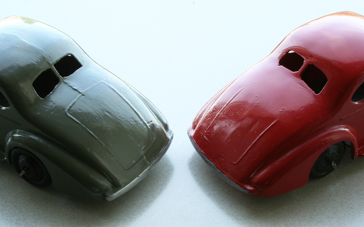 One of both grilles next to each other, frontal. See the sharp hand painted edges of the silver of the red one opposed to the faint, mask produced contours of the grey (British) one. By the way, please note the rather deep recesses that the frontal die part left on the French version, above the head lamps. Also: are more badges seen picked out in silver, as on my French one?