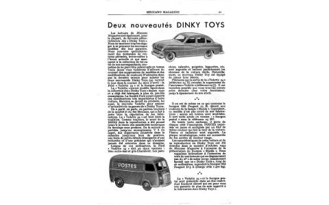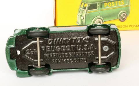 The French black and white catalogue of 1954 shows the model for the first time, even in colour on the back of the cover. As a Dinky Toy, renumbered 560, the Fourgon postal is included finally in the 1960 catalogue, but still without the contemporary concave hubs.