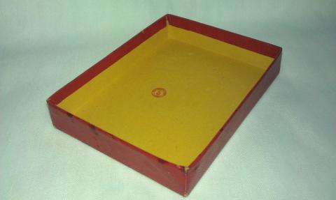 12 Red plasticized cardboard lid box with upper blue triangular label; inner packing piece for 10 milk churns and room divider as a garage       Red plasticized cardboard lid box with yellow front label; inner packing piece for 10 milk churns and room divider as a garage