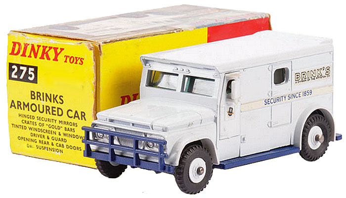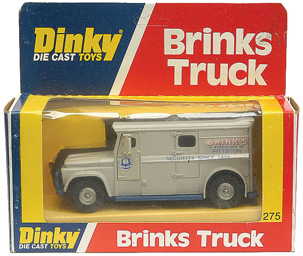 The Dinky 275 had two official names, it has first been issued as : "Brinks Armoured car" without an apostrophe at Brink's and later as Brinks truck" still without the apostrophe. This is confirmed by the names printed on the boxes.