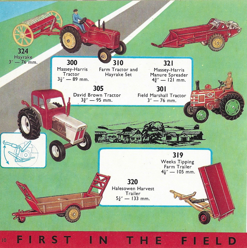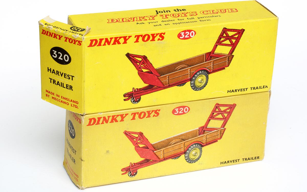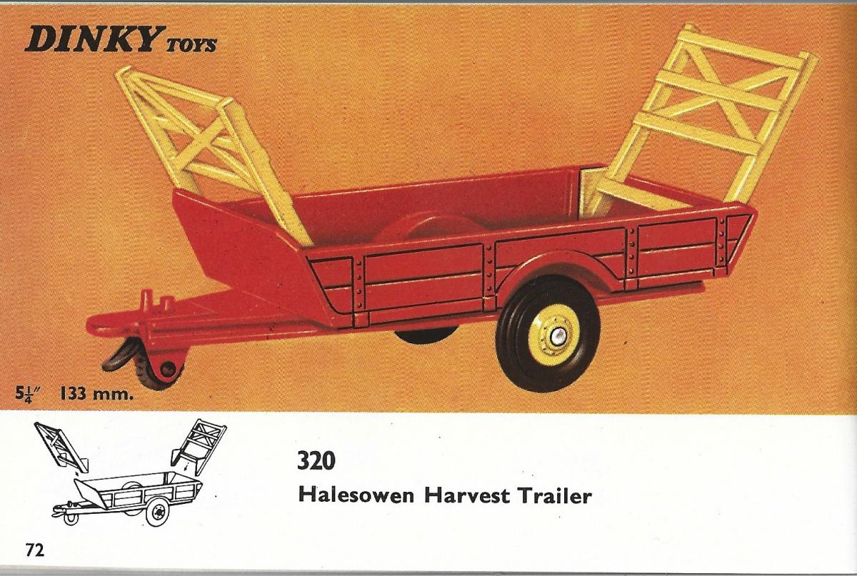 In the catalogues the trailer is named as Harvest Trailer or as Halesowen Farm Trailer or as Halesowen Harvest Trailer. All boxes mention Harvest Trailer. Only the plain box 320 mentions Halesowen Harvest Trailer.