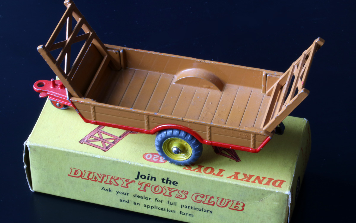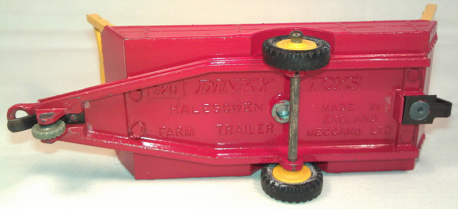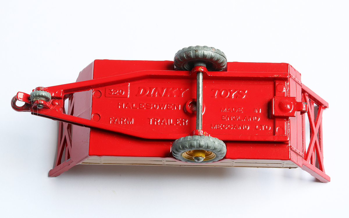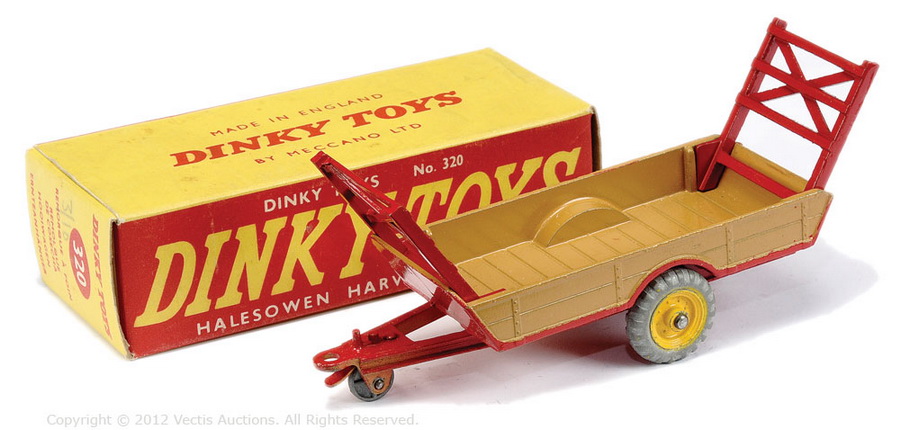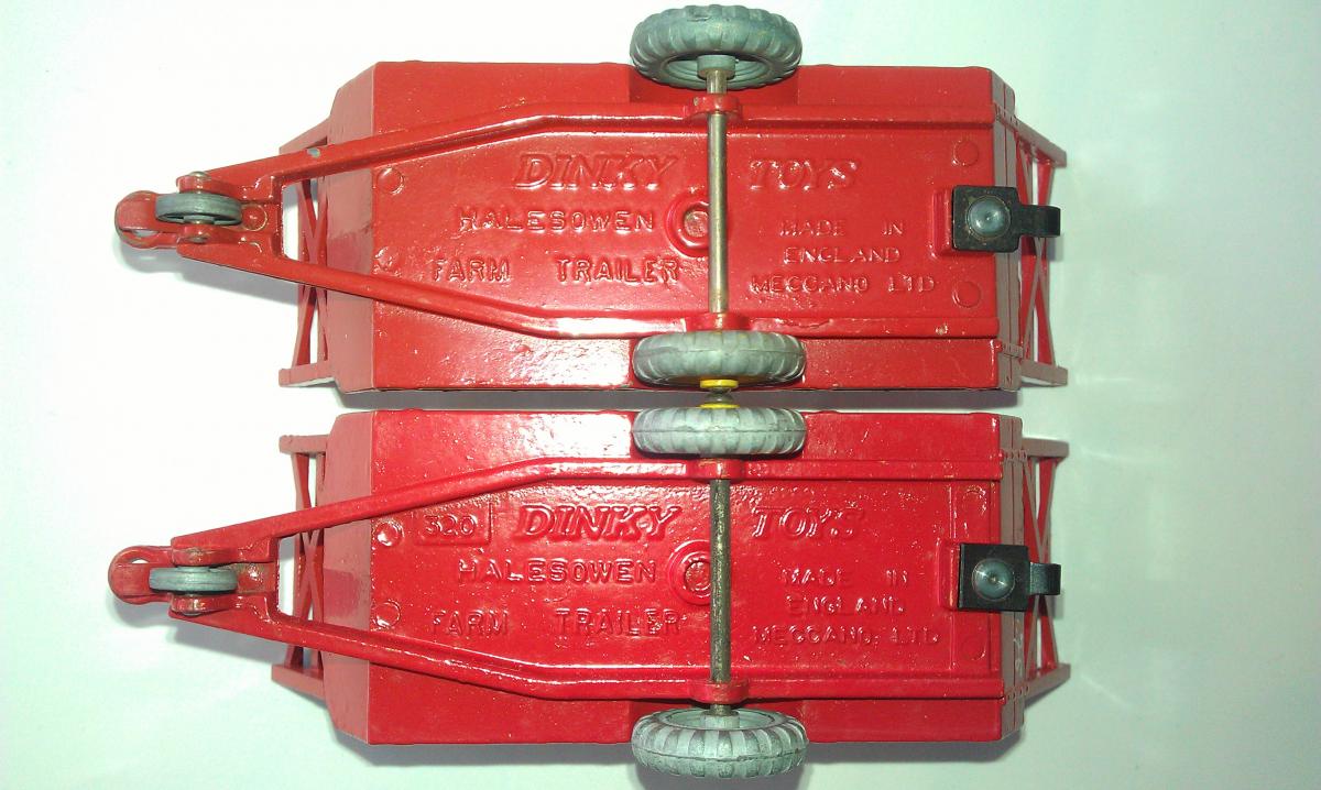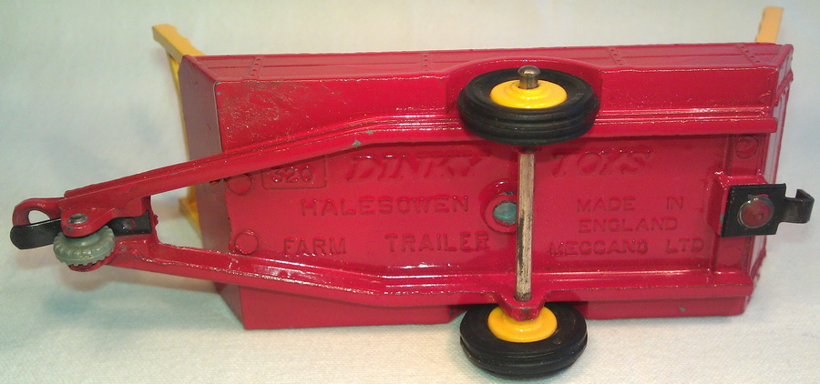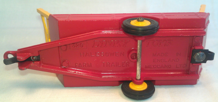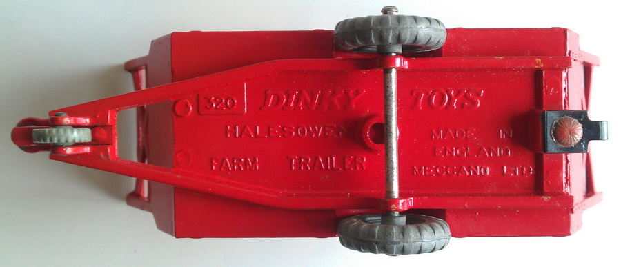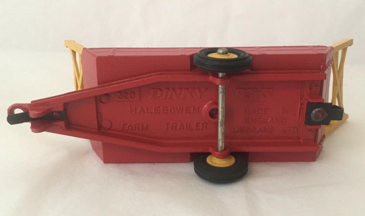 3. Dinky Toys 320 Halesowen Harvest Trailer 5th base with number 320, painting ring and a raised area on both sides of the tow bar. Metal wheels. Red racks.