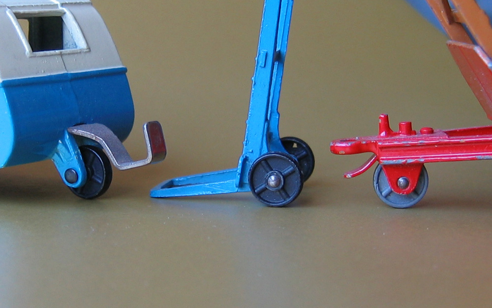 Hi Jan, I can add a slightly different one now, the latest of the traditional version with all-diecast wheels, showing the plastic jockey wheel and the red painted hook, which means it was fixed before the red paint job was done. The ejection marks seem to be slightly different too. Also a new picture of the yellow 27B numbered trade box with three models. They have each unpainted hooks, same colour racks (packed in tissue paper) and paint spraying holes underneath. Kind regards, Jan W
