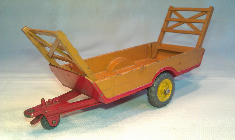 1. Dinky Toys 27b Halesowen Harvest Trailer 1st base without number and painting ring. Metal wheels. Brown racks.