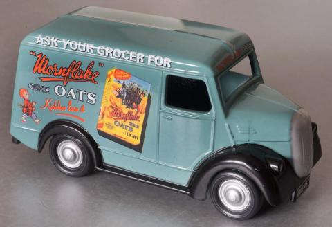 These castings are almost identical to the Dinky Trojan, apart from the obvious missing front bumper and addition of numberplates front and rear. They were made in China, with black plastic baseplate and wheels, and it does seem obvious that a slightly modified Dinky casting was used as the master. The box gives information about the Mornflake Oats Company of Crewe, Cheshire, which was established its cornmills in 1675 and has recently had a complete change of livery on its vehicles. The box also shows a nice photo of the real Trojan at work in the 1950's.