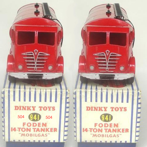 It was a short time of issue for the Dinky Toys 504 - 941 Foden tanker Mobilgas. From May 1953 to June 1955 when it was replaced by the Dinky Toys 942 Foden tanker Regent.