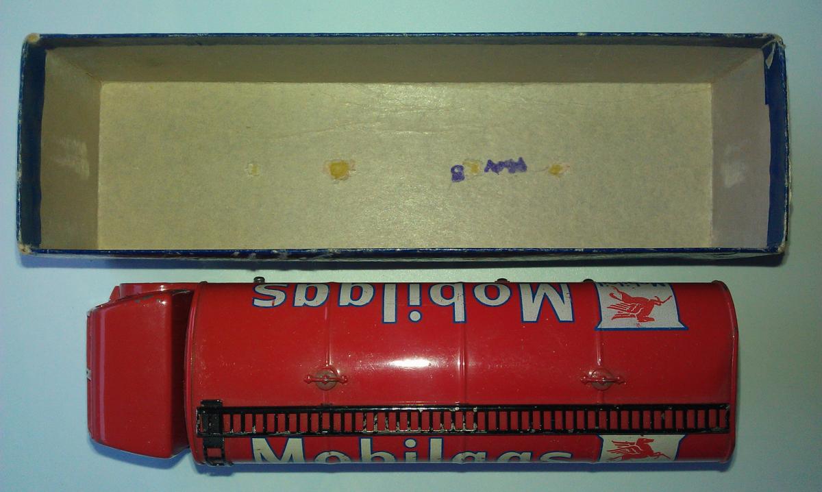 I think that this one is a unique example with not only reversed transfers on both sides of the tank, but also a Mobil gas Horse transfer on the front and rear side of the tank. I never saw a picture of such a model with also a transfer on both end sides of the tank. That’s why I feel it as a golden catch. I show pictures of the tanker at the end in full size so you can judge this by yourself. It is its 1st issue with red filler caps and its 1st type blue box with orange/white label. It has some minor damage but is still in a very good condition to show it in my display case together with my other DT tankers.