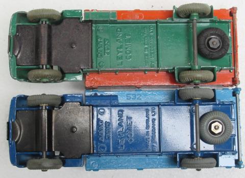 Hi Richard and Kas, the Leyland Comets with Hinged Tailboard shown below all have the reinforcement as mentioned by Richard. From left to right an unnumbered 532 (dark blue with medium blue body and hubs), a numbered 532 (green, orange body and cream hubs) and a numbered 418 (green, orange body and green hubs). Kind regards, Jan