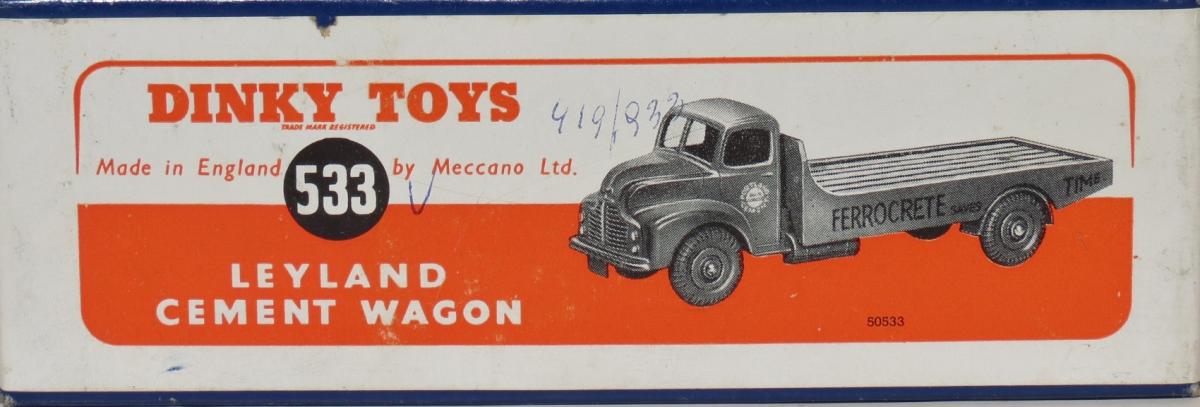 I have just received a 533 Portland Cement lorry with the normal grooved hubs.  Maybe Bruce could decipher the stamp on the inside of the lid?  The price on the end is 6/10.  The box illustration shows grooved hubs.  I also have a 419 to compare.   The 533 is marked as a Supertoy and has '533' on the tray casting.   The 419 is a Dinky Toy and has '419' under the tray.