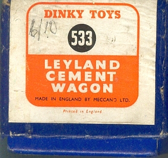 The inspection date for my 533 in a blue striped box adds information as to when this style of box was first introduced for the 533 Leyland Cement Wagon replacing the blue covered box with orange and white label. (The honour for being the first model packaged in this new, brighter blue-striped box goes to the 582 Pullmore Car Transporter in April 1953.)