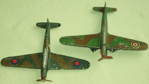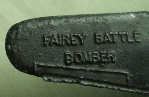 The Dinky Fairey Battle is an accurate rendition of the aircraft, initially produced with landing gear, which was eliminated after April 3rd, 1940. Various RAF roundels were used during its production. Initially issued as Fairey Battle Bomber 60n (1937-1941) it was painted silver and had cockpit blueing. On the 14th of April 1939 the name 'FAIREY BATTLE BOMBER' was to be cast under the wing. In 1940 it was renamed Medium Bomber 60s and was painted in two colour camouflage with black underside, usually with only one decal on one wing. There were both light and dark camouflage finishes. There were also mirror image camouflage finishes made for boxed sets. Some of these had black & white undersides. All versions have a three-blade propeller, painted red.