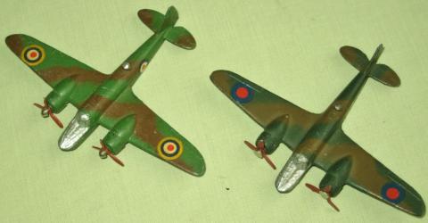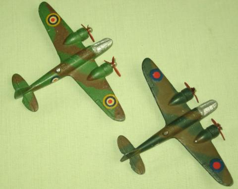 The Dinky Bristol Blenheim was first issued as Blenheim Bomber 62b as a one-piece casting, painted in silver. It was never issued with a gliding hole or landing gear. Later it was issued as 62d with two colour camouflage and black & white underneath. The camouflage could be either light or dark with different roundels. It had a silvered cockpit and gun turret.