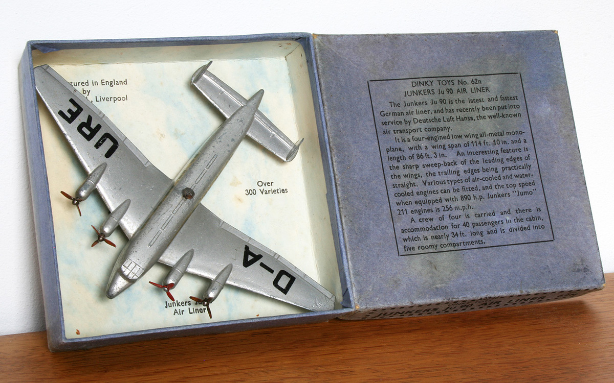 Model changes and identity issues re the 62n Junkers Ju-90 are even more chaotic than usual. As the lovely model illustrated reveals, when first issued in 1938 as the 62n Junkers Ju 90 Air Liner it was named as such, had a gliding hole in the top and bore a reasonably close resemblance to the real thing. With the outbreak of war in 1939, rather than turn out a model of a real German bomber like a Heinkel He-111, they gave their Ju-90 airliner a coat of semi-matt black paint on top, semi-matt pale blue below, eliminated the gliding hole, applied black crosses outlined in white to the wings, swastikas to the tail fins, and in 1940 pretended it was a German four-engined bomber called the Junkers Ju-89.