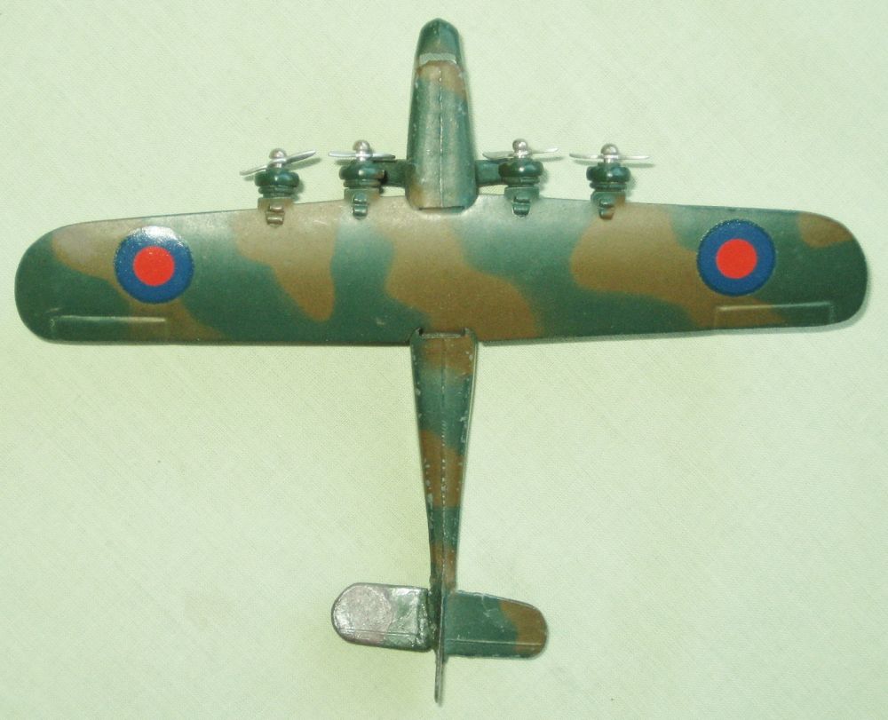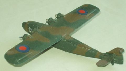 The Heavy Bomber 66a is a camouflaged version of the Imperial Airways (Liner) 60a. The Armstrong Whitworth Atalanta was a 1930's airliner built for Imperial Airlines. In 1941 the remaining 5 aircraft were impressed by the RAF for use in India.The Dinky Heavy Bomber has a tinplate wing with 4 attached diecast engines, each with a 2 bladed tin propeller. The wing is mounted on a one-piece diecast fuselage. The landing gear is a simple axle with 2 large sized metal disc wheels. It was issued in both light and dark camoufflage. This is the dark version. The underside is painted a dull black. There is no name on either the fuselage or the wings.