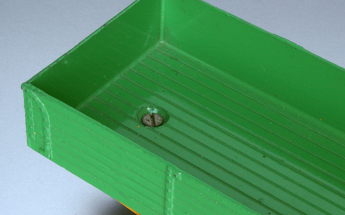 Hi Jan, a mystery indeed. I got this Foden from a friend who had it from new. It still has its original dual-numbered box, with a date stamp of M1 55 (?) as shown. I have noticed that some bodies have different sized mounting holes at the rear - would this have happened when the screw, nut and washer fixing was changed to the rivet?