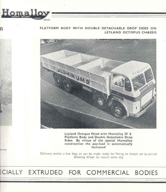 Brochure Leyland Octopus chassis with Homalloy Bodies. Delivery within a few days or can be made ready for fitting to chassis on its arrival allowing driver to return same day.