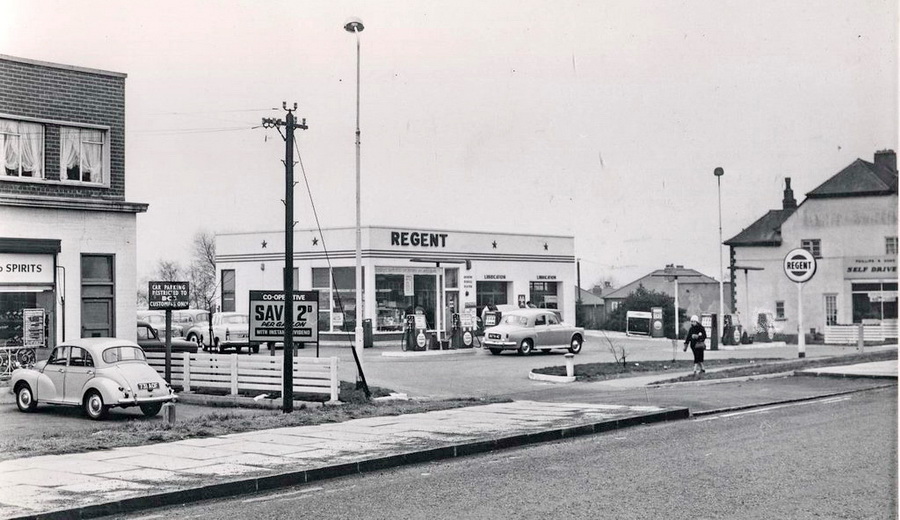Regent petrol station Quinton Birmingham 1950"s (with Dinky Toys Morris Oxford and Rover 75 ?? in sight)
