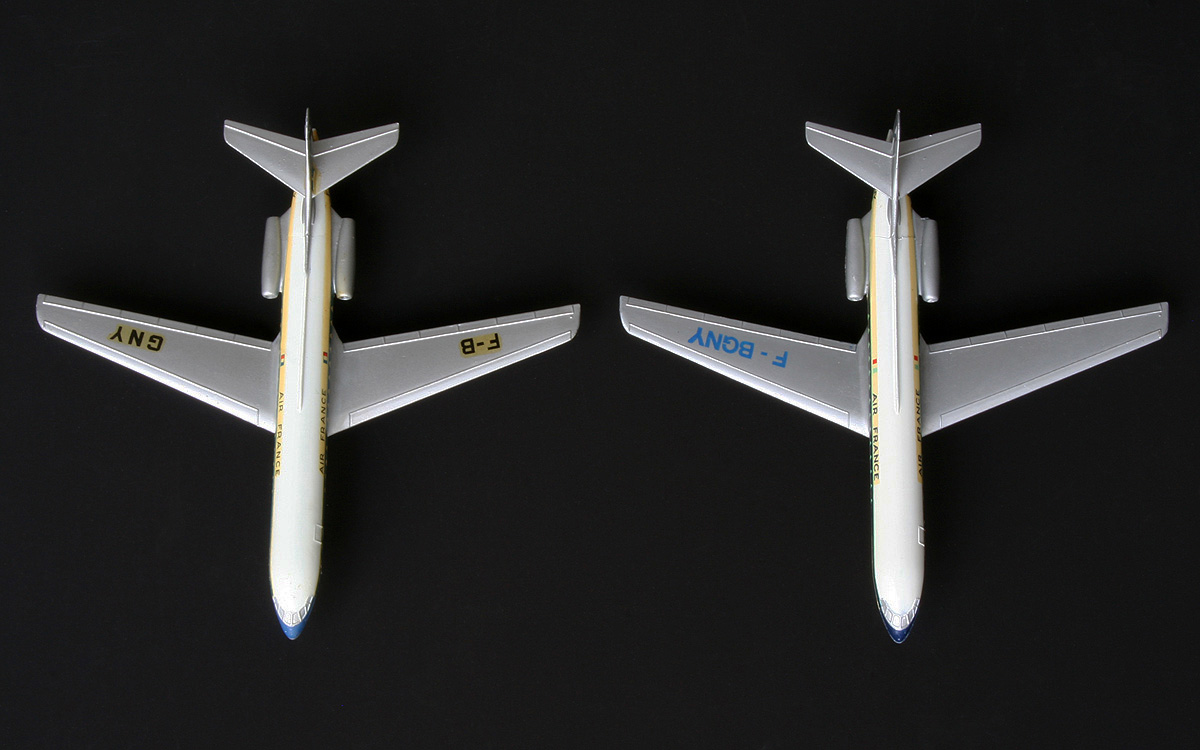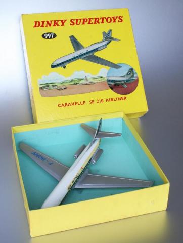 The dies for the French no. 60F S.E. 210 ‘Caravelle’ were temporarily in use in the Liverpool factory, some time in the period 1961-1965. Bearing the number 997 and under the name ‘Caravelle SE 210 Airliner’ this now British Dinky Supertoy fitted nicely within the range of bigger British aircraft models, preceding no. 998 Bristol Britannia Airliner and no. 999 D.H. Comet Airliner. As the numbers between 992 (Avro Vulcan Delta Wing Bomber) and this trio have never been used one may wonder what aircraft models Meccano could have had in mind filing that gap (only briefly – 1954/55 – interrupted by a no. 994 for the separate loading ramp for 982). The Caravelle was announced as ‘NEW’ in the first MM issue of 1962. The die for the lower half underwent some small changes and different transfers were applied. For some specific parts, like the wheels, the British made use of available British parts.