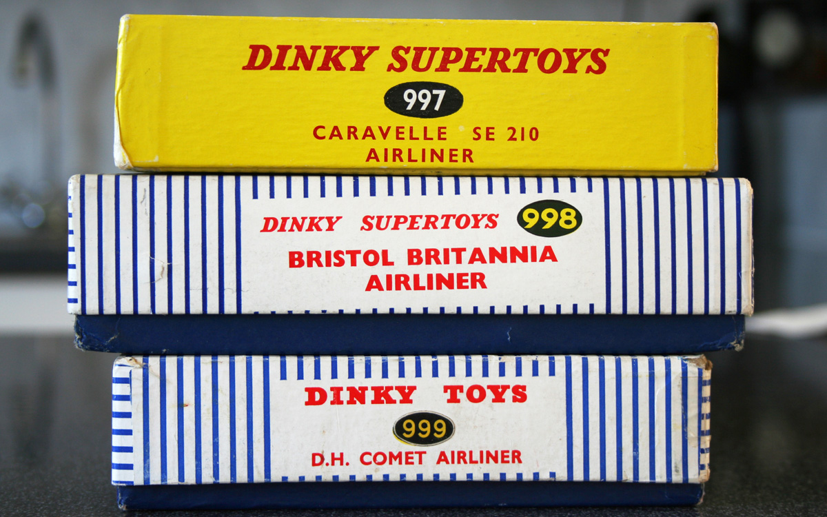 Obvious is the different box, in the contemporary British all-yellow colour, with an airport scene and hinged gangway demonstration detail. Sue Richardson mentions a striped Supertoys box, but I haven’t seen one. Did others?