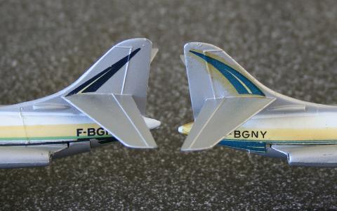 The small riveted covers for the landing gear attachments are made of shiny metal instead of the grey metallic body finished ones on the French one.