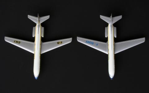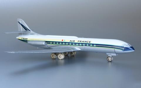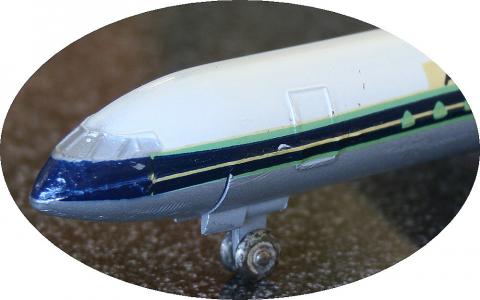 The wheels of the landing gear are slightly smaller and made of the same wear prone metal as the other British aeroplanes, whereas the French use the more stable darker finished kind of metal. The final British Caravelles of 1965 had black plastic wheels.