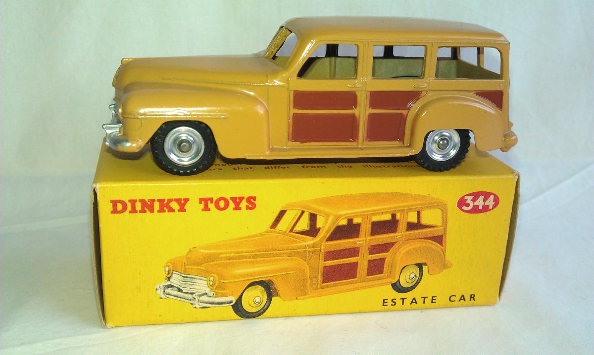 Dinky No.344 Estate Car - light brown with dark brown panels, spun hubs, ridged black tyres and later baseplate with No.344 inscribed - Near Mint in Fair dual numbered picture box. Scarce.