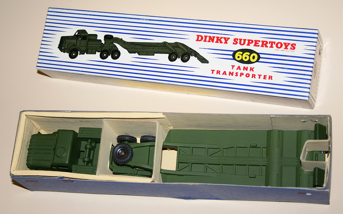 In the mean time I came across a ten year old photo which I took when I had the pleasure to add a virtually mint boxed no. 660 Mighty Antar Tank Transporter to my already present childhood example, which had been repainted many times since 1956. The model was so nice in its fully original packaging that it took me some weeks to muster up the courage necessary for taking it out of the box with all its untouched interior packing pieces. As you may be able to see the staples look threatening, and might do serious harm to the pristine model (as often happens with many models inside). After taking it out I never put it into this box again since then. Kind regards, Jan
