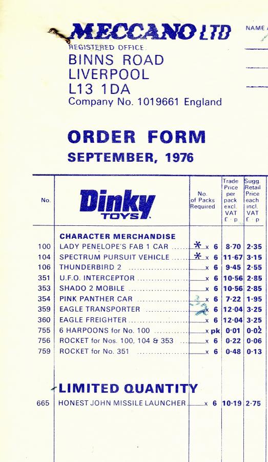 Al, the Honest John was included in the 1975 catalogue. It is listed on the last page of the included price list under the heading of "Space has not permitted us to illustrate the following items in this book". This indicates that those models are on their way out, so it was somewhat surprising to see the 665 Honest John still mentioned in the September 1976 Meccano Order Form.