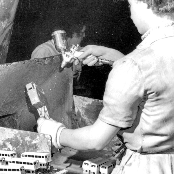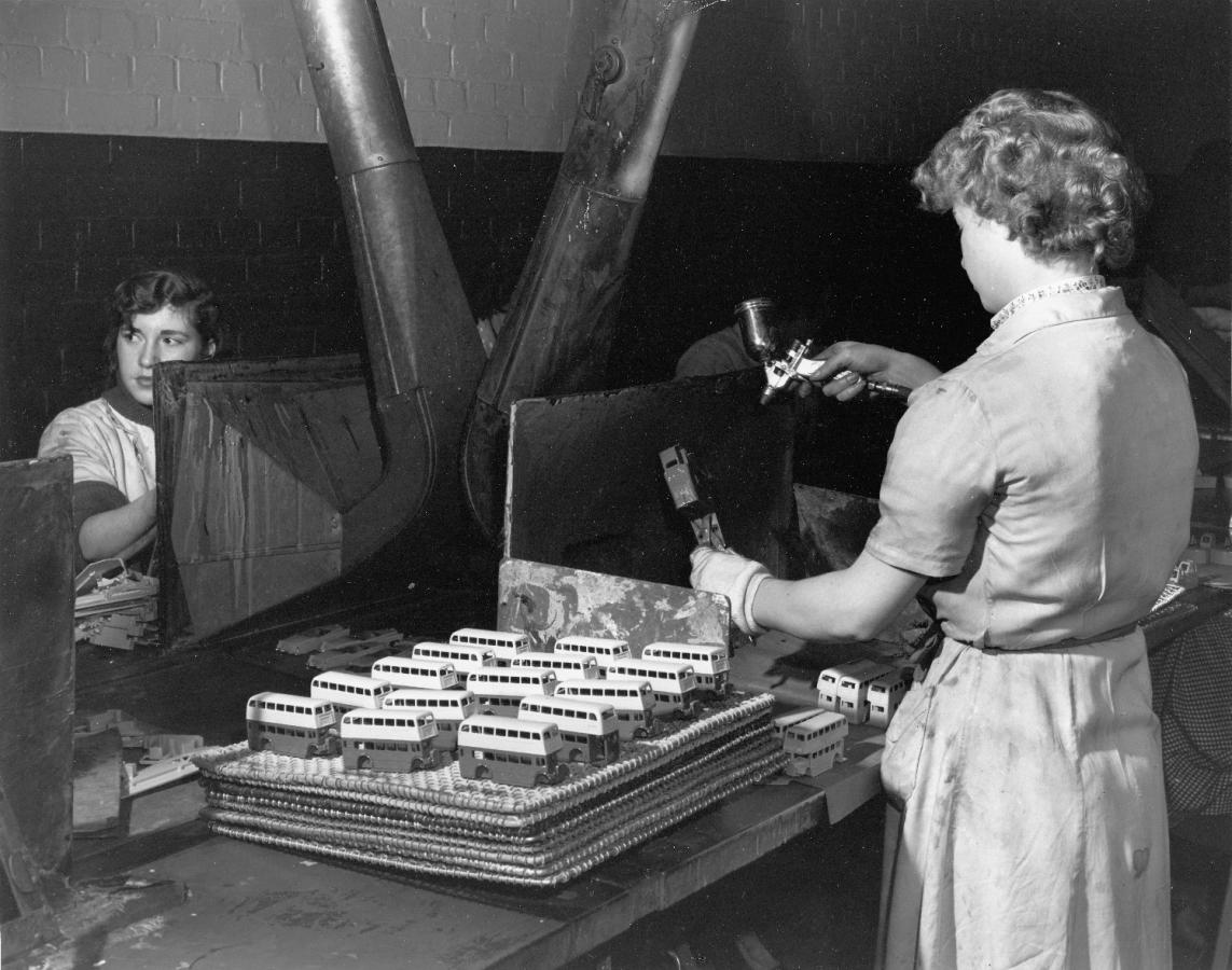 Photo 2: The lady appears to be spraying the radiator grille and headlights of the Single Deck Bus. The nose of the bus appears to be pushed perpendicularly into the mask with the radiator grille and headlights and pressed down firmly to prevent overspray. The flash on the sides are already painted. Also visible are 27f Estate Cars on the assembly line that already are mask sprayed.