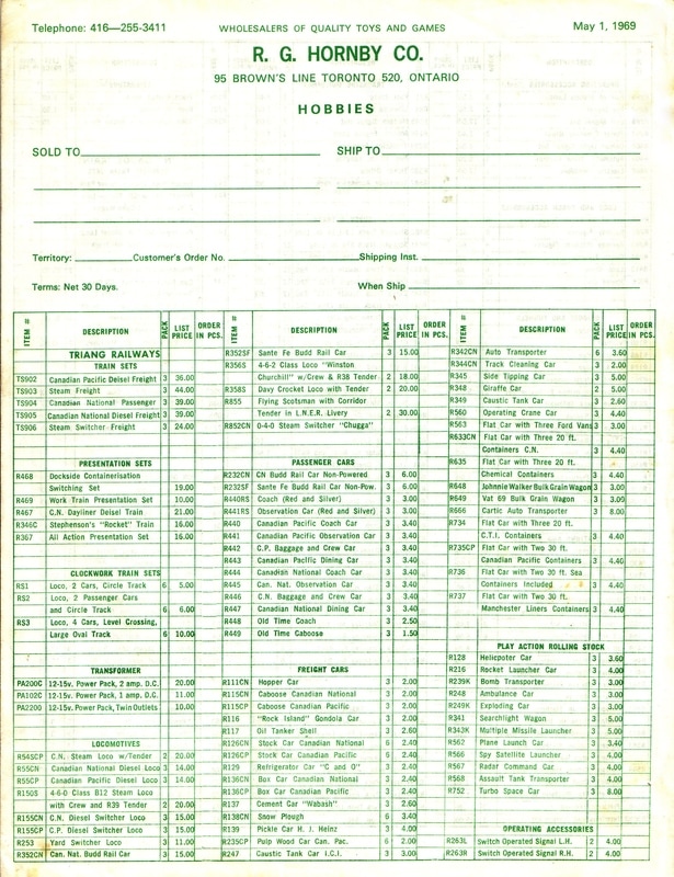 On my further search I came across an order form from Tri-Ang Railways from February 1969 and an order form from Roland G. Hornby Co. from May 1969. Both order forms are addressed at 95 Brown's Line, Toronto, Canada, being the company of Roland G Hornby.