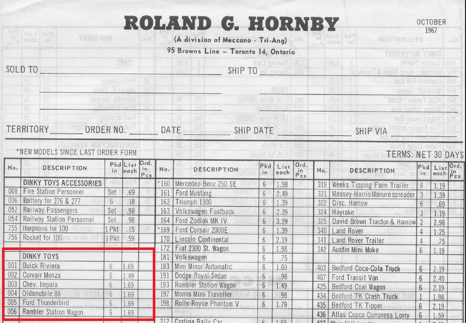 Interestingly, this Canadian Dinky Toys order form of October 1967 also lists Mini Dinky made in Hong Kong: 6 cars and 6 construction vehicles and a complete display with Mini Dinky. Also listed are the Big 6 cars made in Hong Kong.